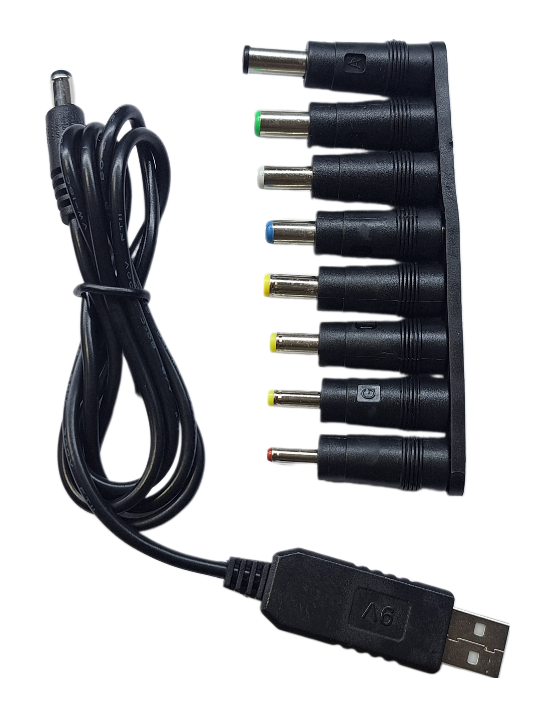 W komplecie znajduje się kabel USB A oraz adapter z wymiennymi końcówkami na bolce w różnych rozmiarach, umożliwiający ładowanie szerokiej gamy urządzeń elektronicznych wymagających zasilania 9V.